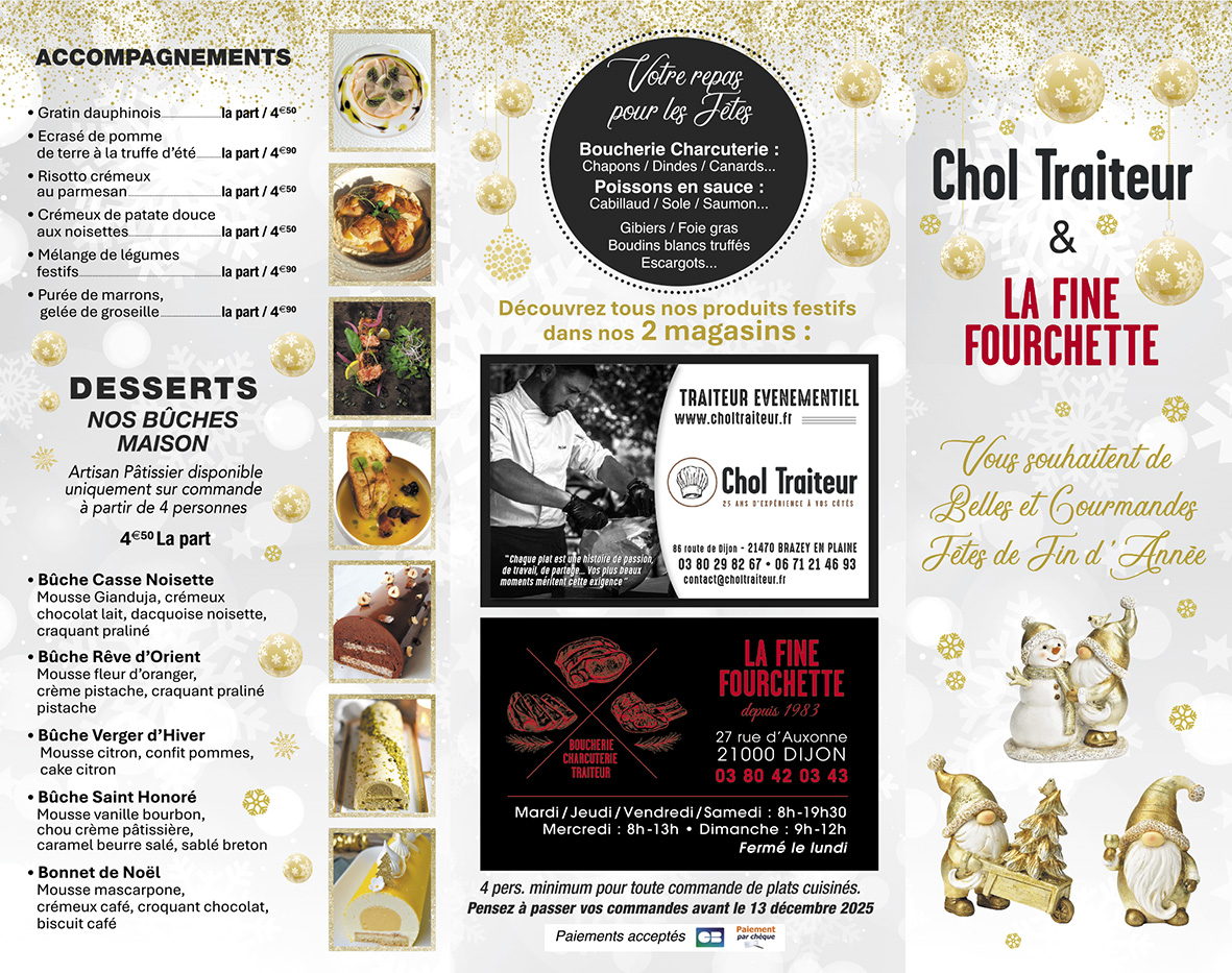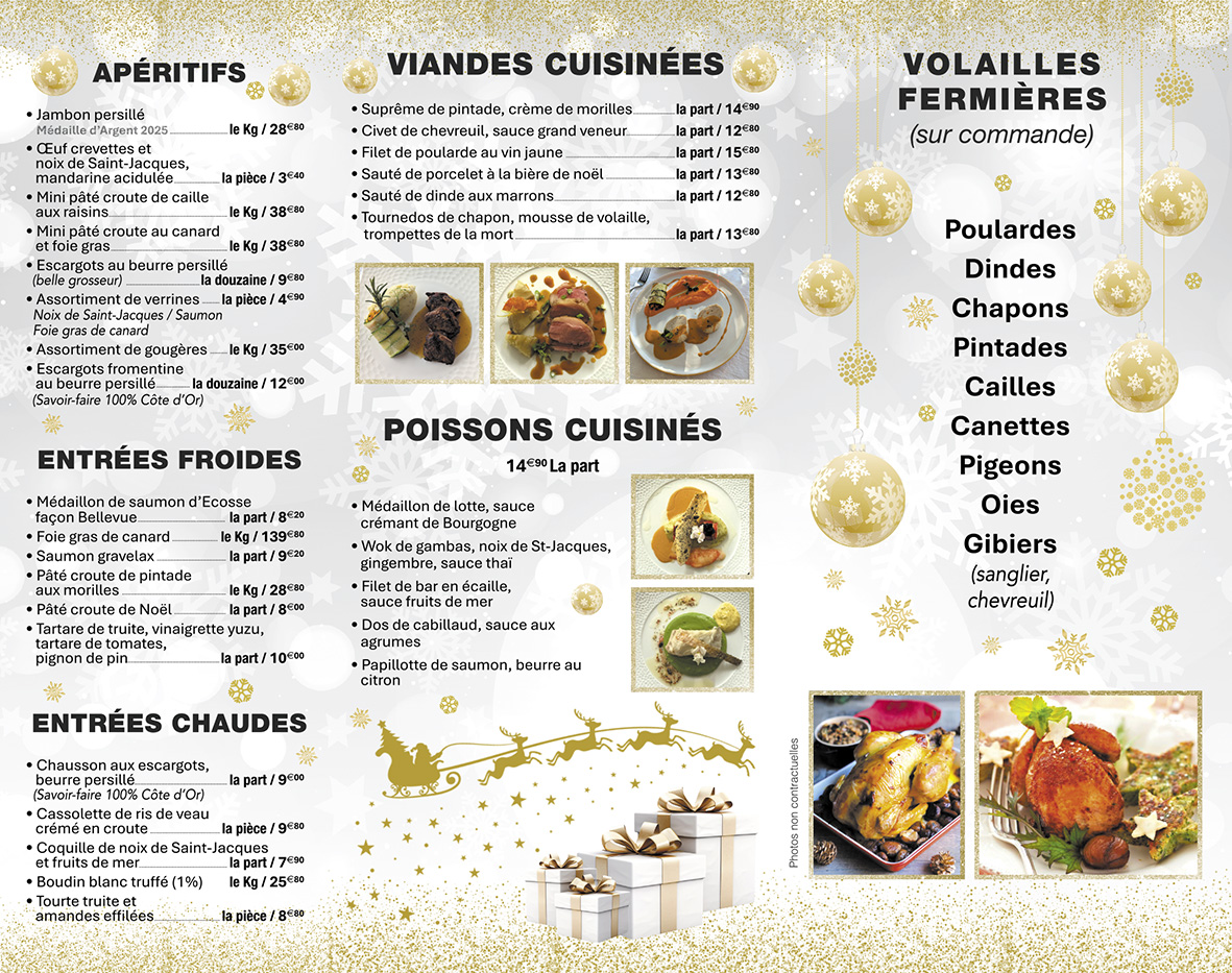 Nous vous souhaitons de belles et gourmandes fêtes de fin d'année. Contactez-nous pour plus de renseignements sur le menu des fêtes de fin d'année.